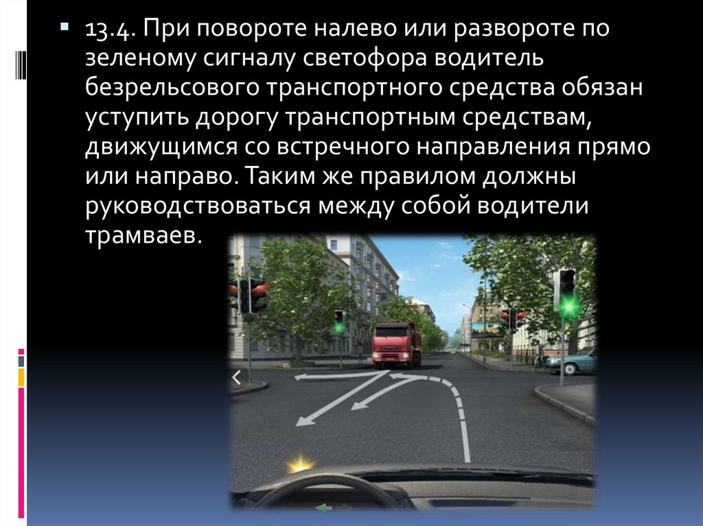 13.4. При повороте налево или развороте позеленому сигналу светофора водитель