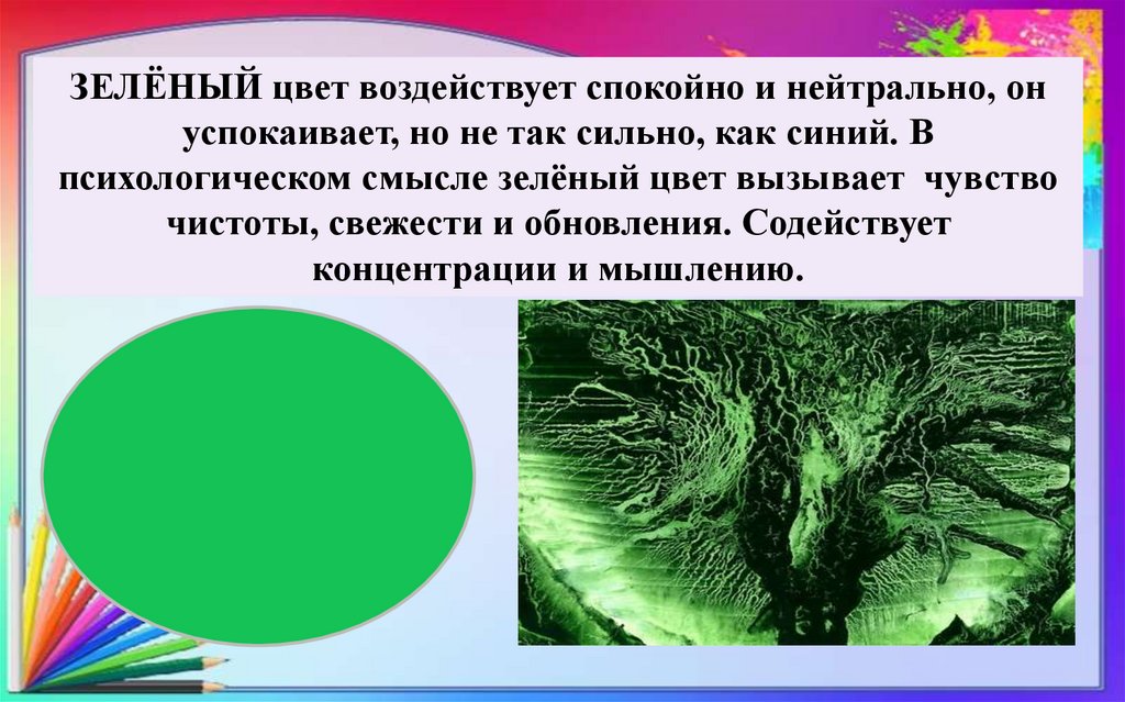 ЗЕЛЁНЫЙ цвет воздействует спокойно и нейтрально, онуспокаивает, но не так сильно, как синий. В