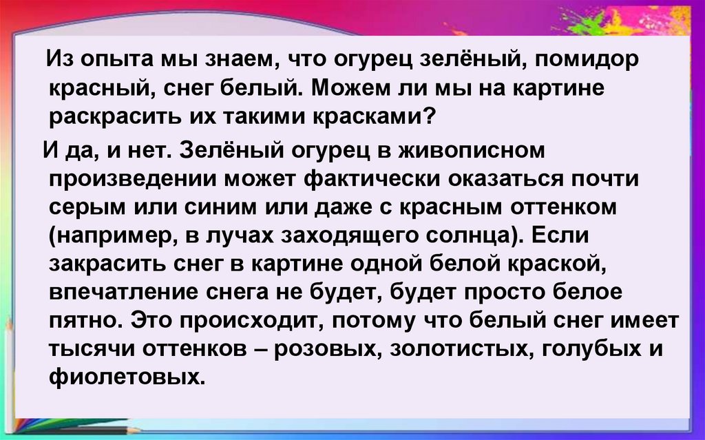 Из опыта мы знаем, что огурец зелёный, помидоркрасный, снег белый. Можем ли мы на картине