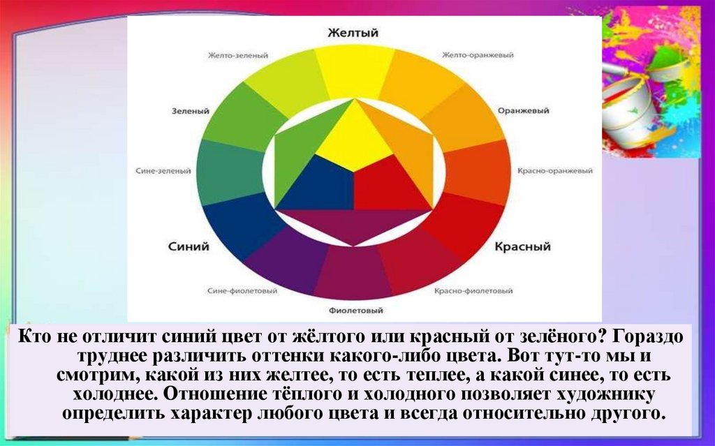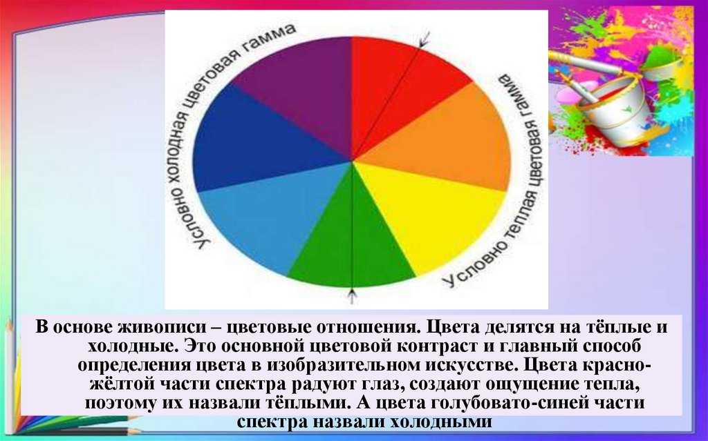 В основе живописи – цветовые отношения. Цвета делятся на тёплые ихолодные. Это основной цветовой контраст и главный способ