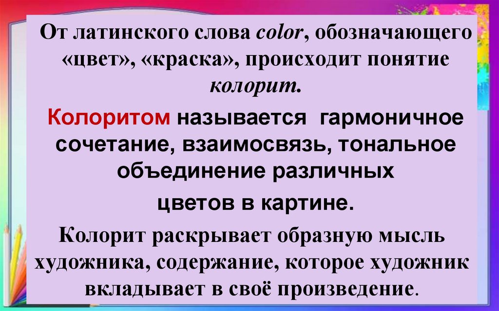 Колорит – это цветовой строй произведения.Колорит раскрывает нам красочное богатство мира.