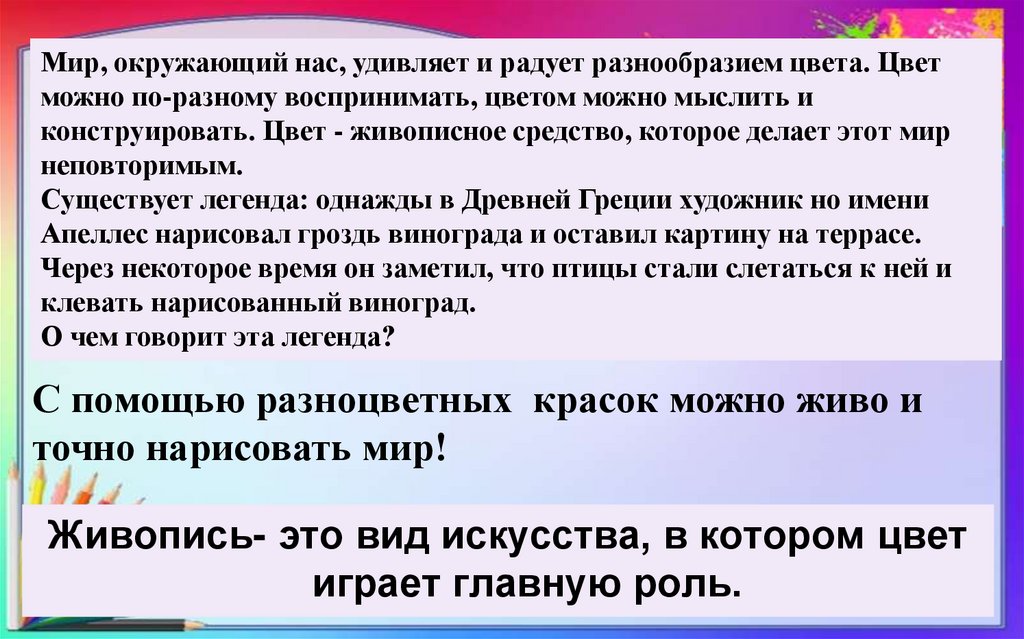 Нас окружает бесконечное множество цветовых явлений,и художник стремится рассказать о них своим особым