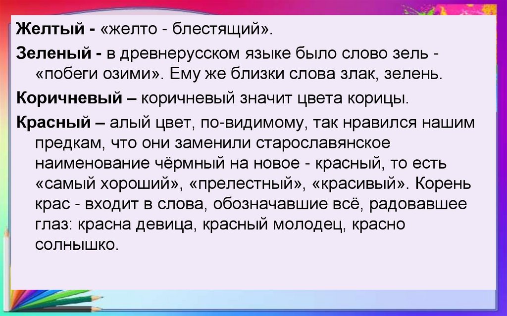 Желтый - «желто - блестящий».Зеленый - в древнерусском языке было слово зель «побеги озими». Ему же близки слова злак, зелень.