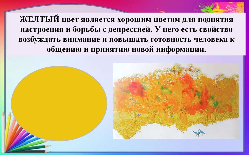 ЖЕЛТЫЙ цвет является хорошим цветом для поднятиянастроения и борьбы с депрессией. У него есть свойство