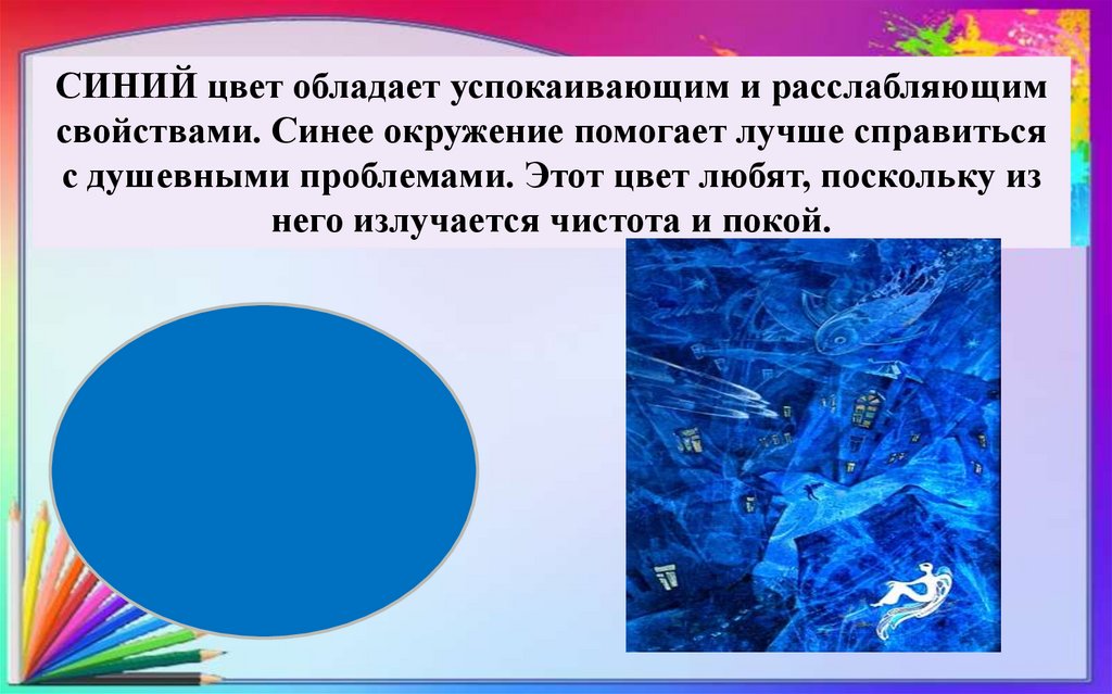 СИНИЙ цвет обладает успокаивающим и расслабляющимсвойствами. Синее окружение помогает лучше справиться