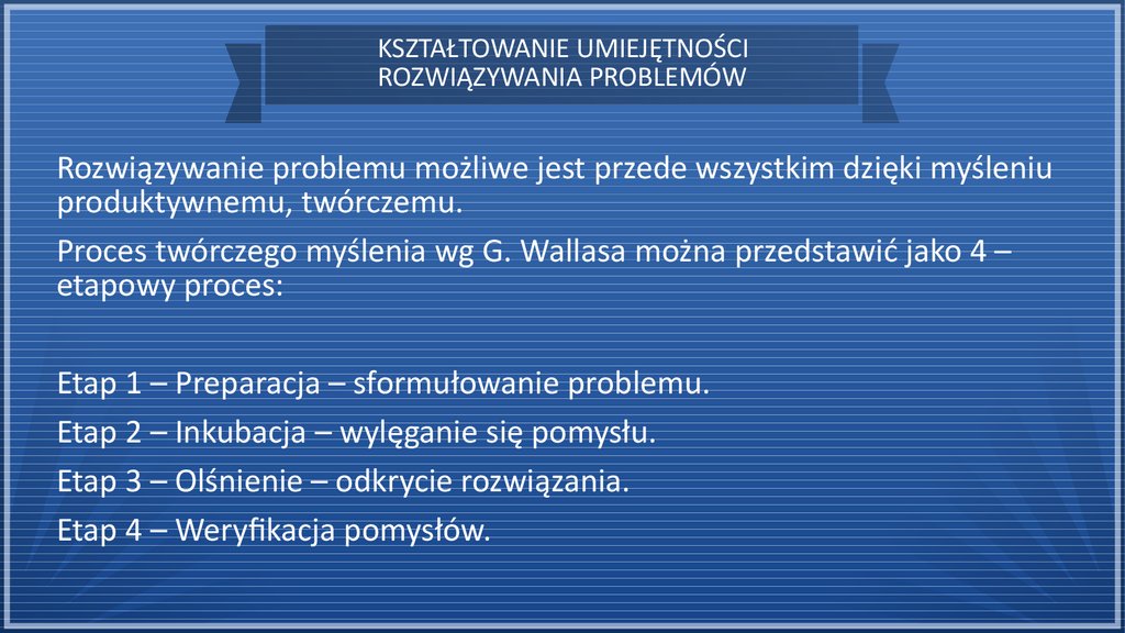 Proces twórczego myślenia wg G. Wallasa można przedstawić jako 4 –