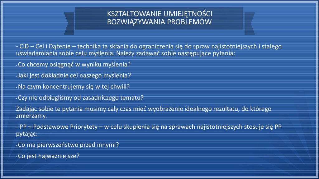 - CiD – Cel i Dążenie – technika ta skłania do ograniczenia się do spraw najistotniejszych i stałego