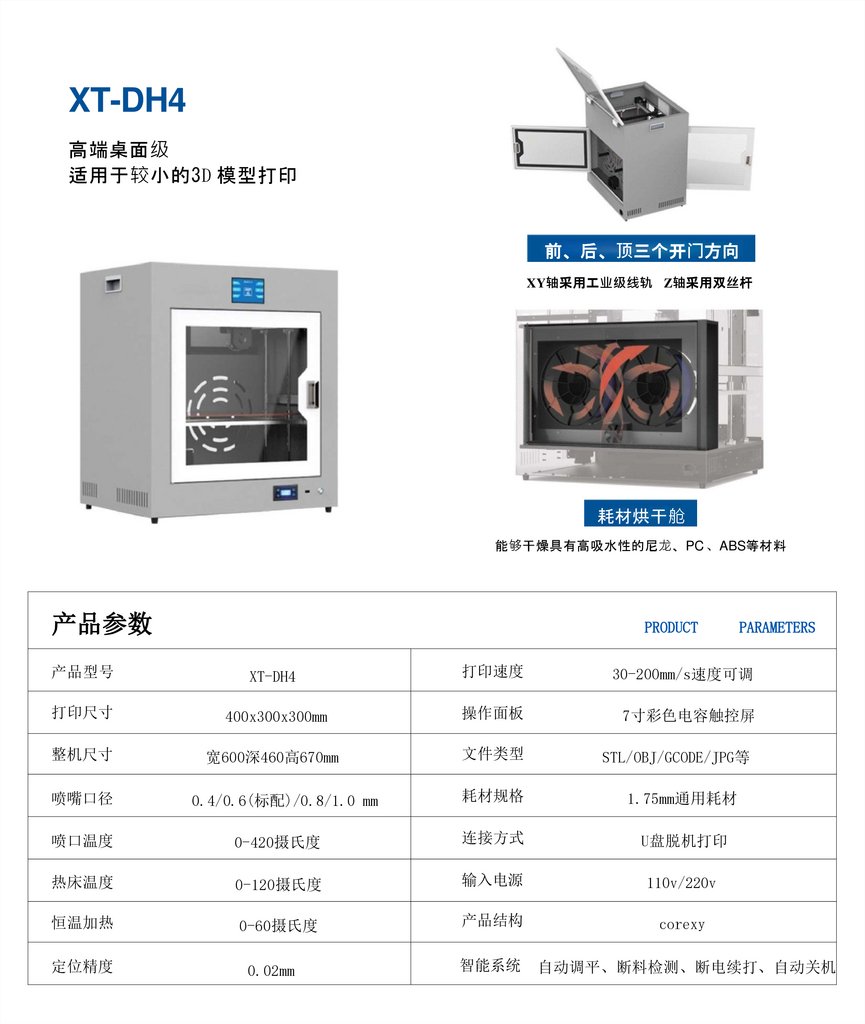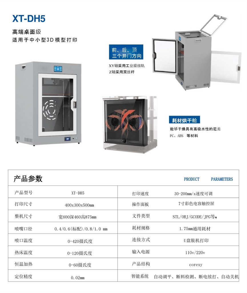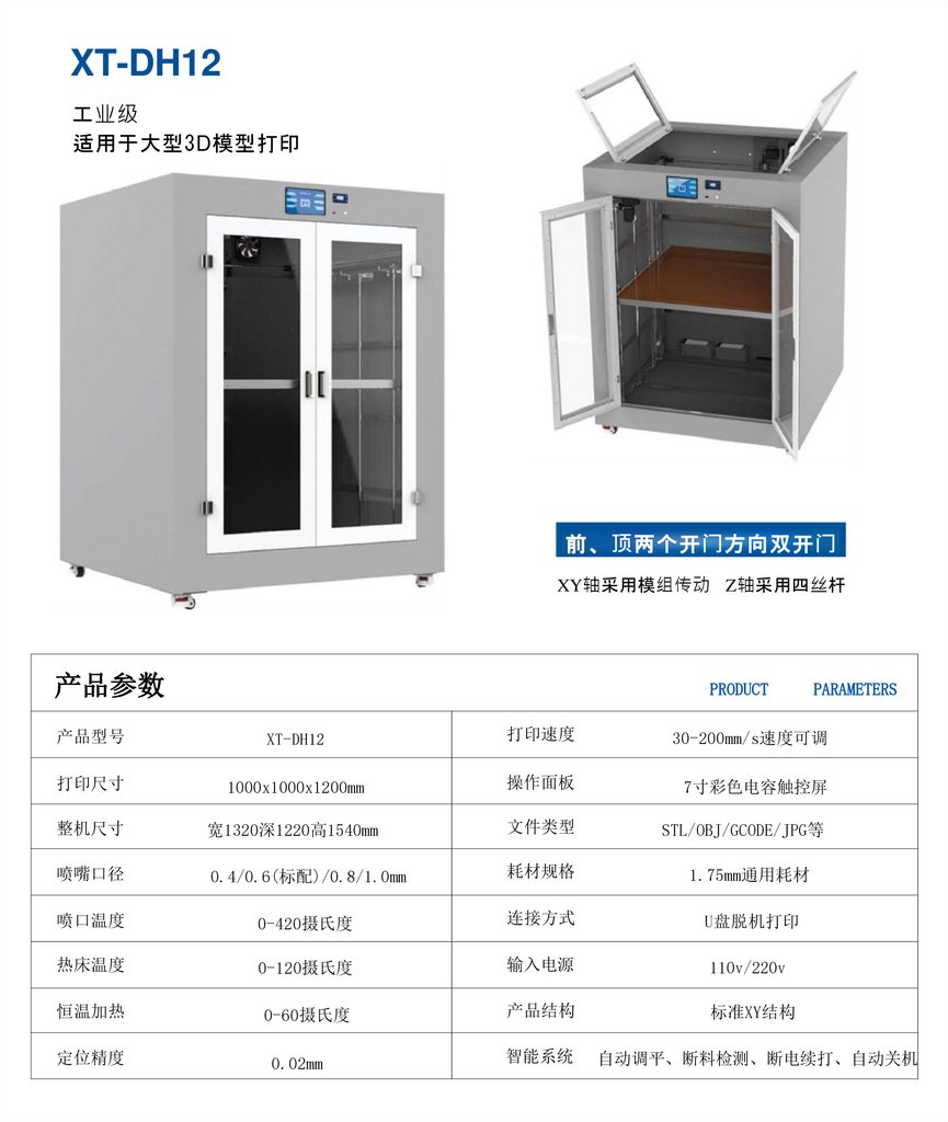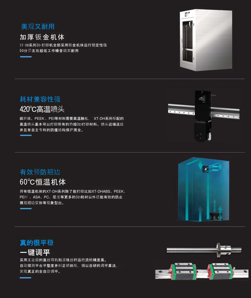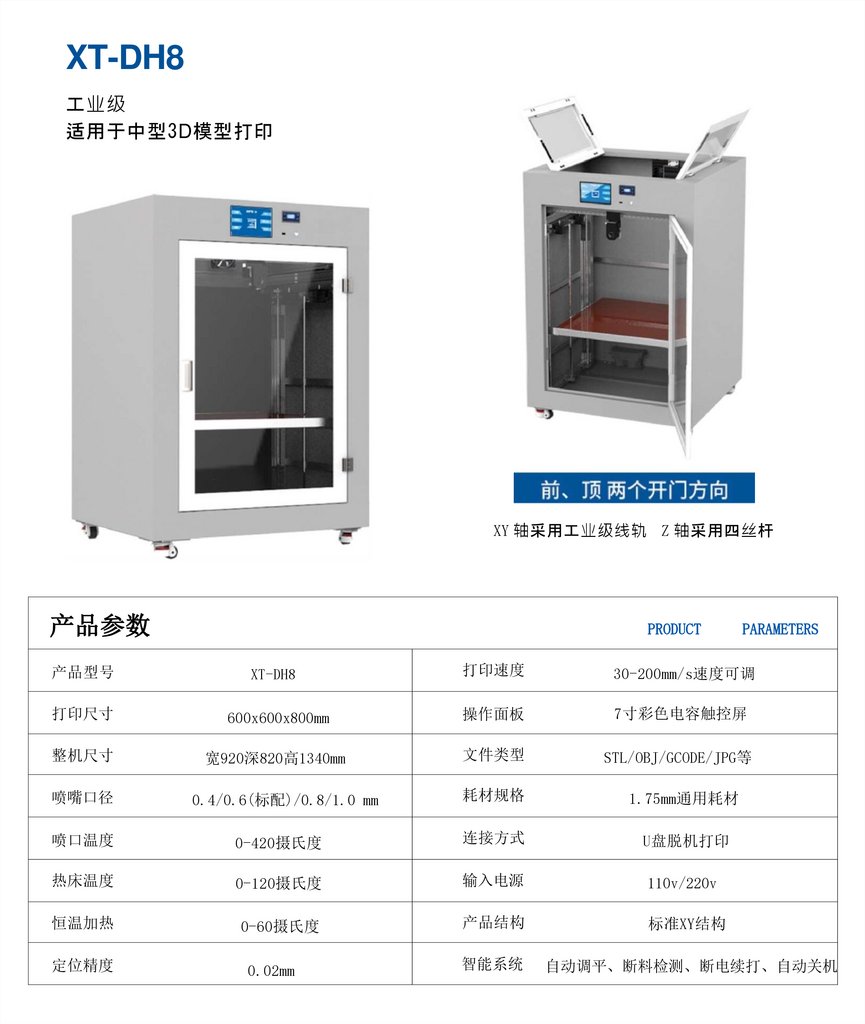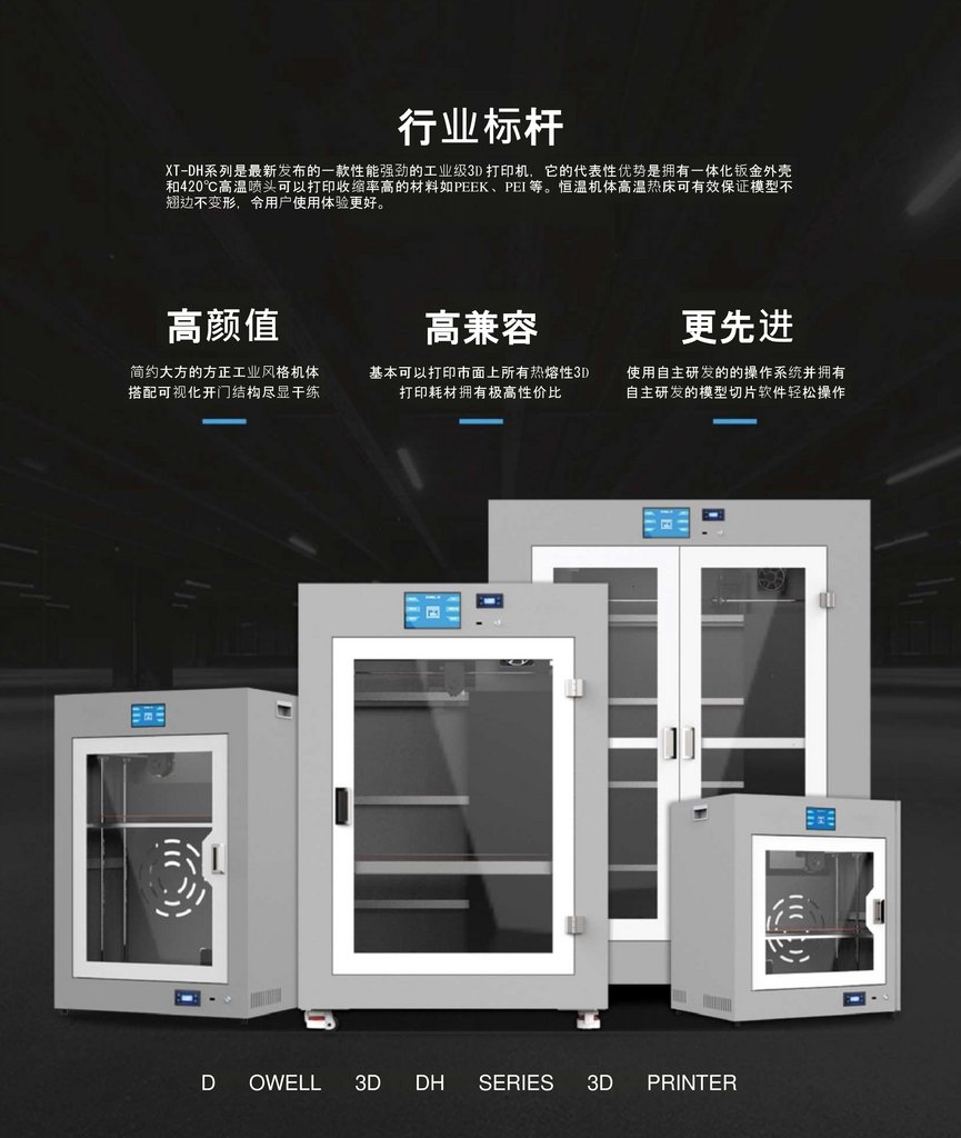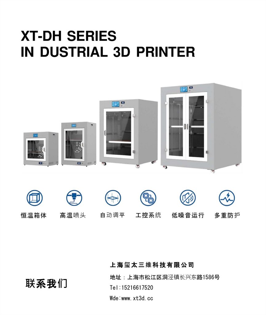 行业标杆XT-DH系列是最新发布的一款性能强劲的工业级3D 打印机 它的代表性优势是拥有一体化钣金外壳