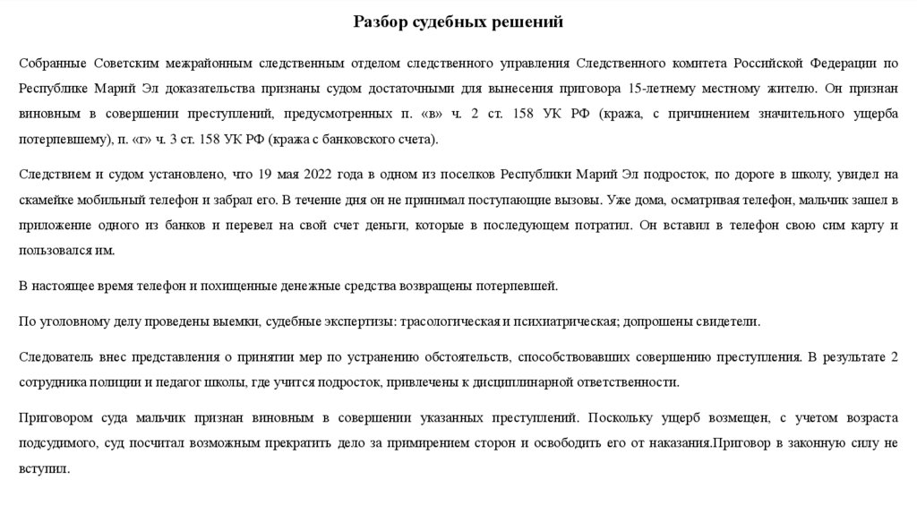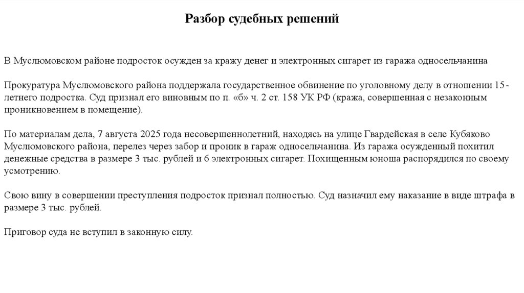 Разбор судебных решенийВ Муслюмовском районе подросток осужден за кражу денег и электронных сигарет из гаража односельчанина