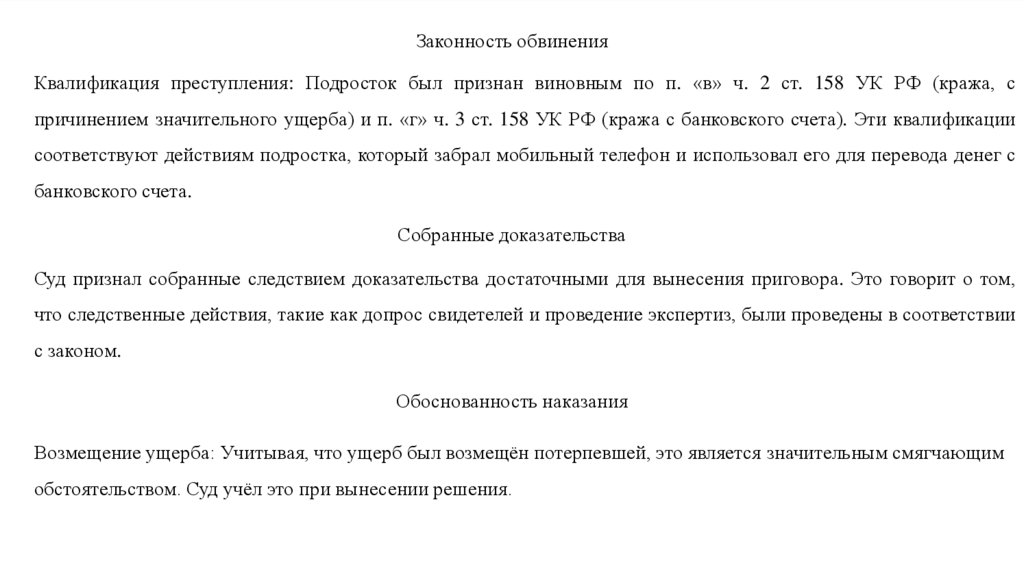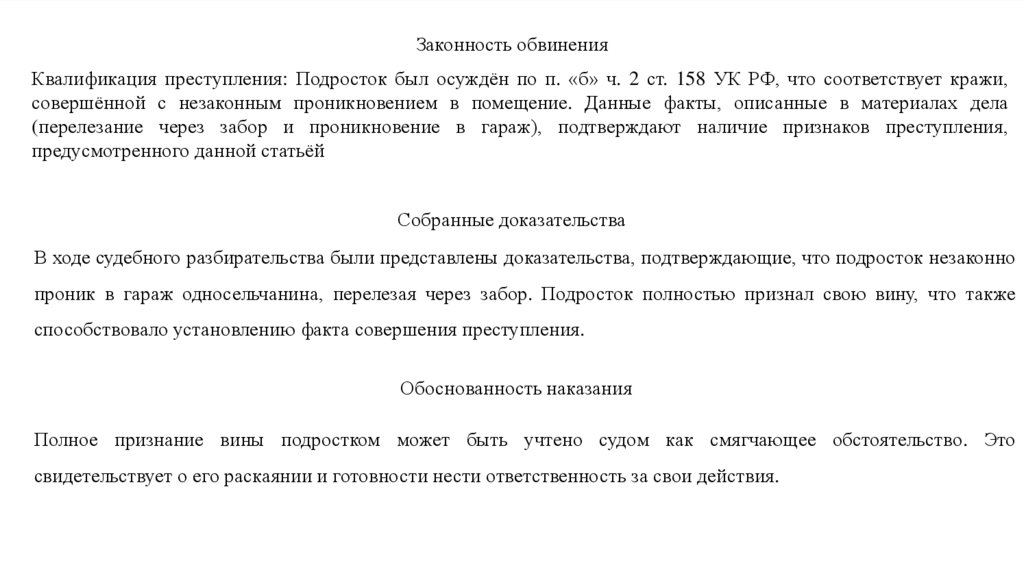 Законность обвиненияКвалификация преступления: Подросток был осуждён по п. «б» ч. 2 ст. 158 УК РФ, что соответствует кражи,