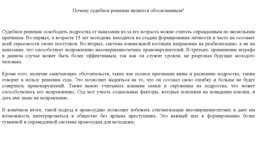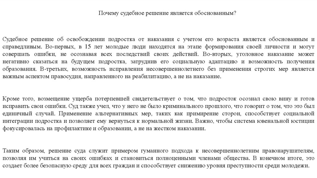 Почему судебное решение является обоснованным?Судебное решение освободить подростка от наказания из-за его возраста можно считать оправданным по нескольким