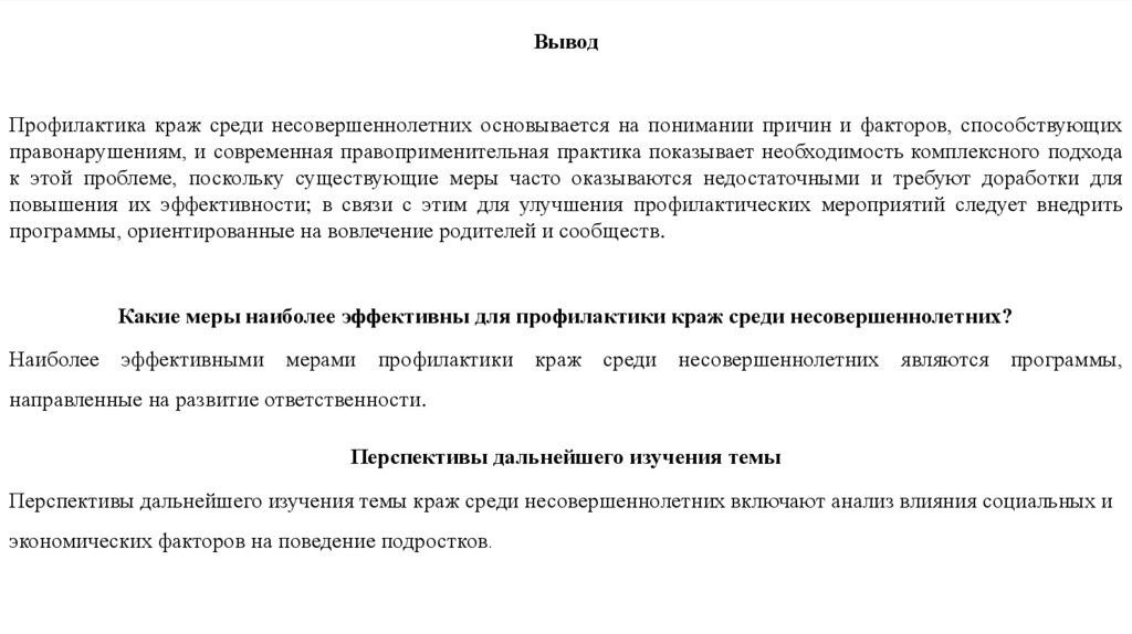 ВыводПрофилактика краж среди несовершеннолетних основывается на понимании причин и факторов, способствующих
