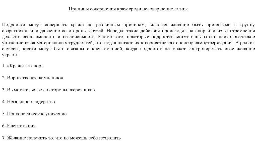 Причины совершения краж среди несовершеннолетнихПодростки могут совершать кражи по различным причинам, включая желание быть принятыми в группу