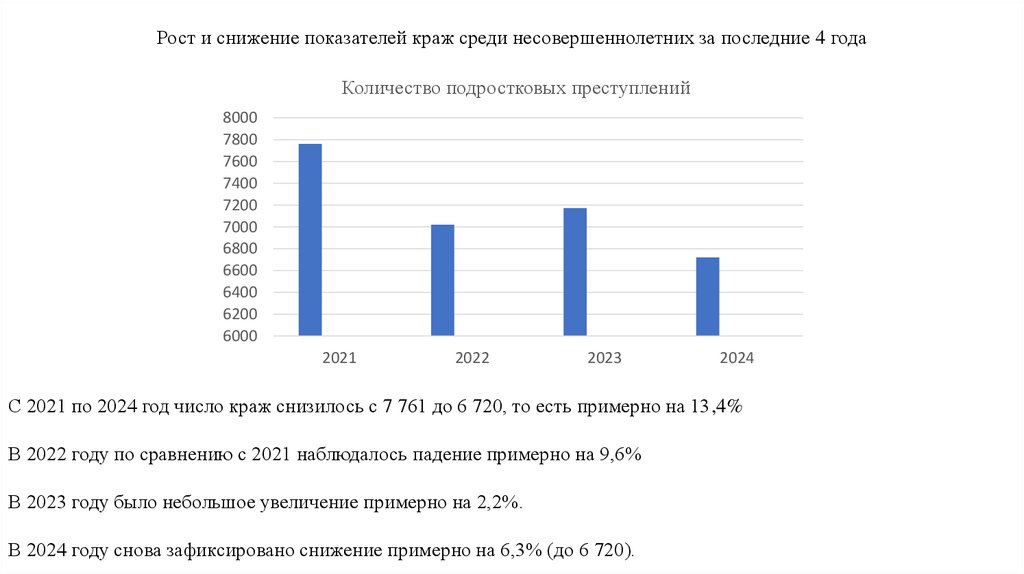 С 2021 по 2024 год число краж снизилось с 7 761 до 6 720, то есть примерно на 13,4%