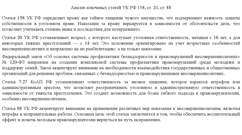 Анализ ключевых статей УК РФ 158, ст. 20, ст. 88Статья 158 УК РФ определяет кражу как тайное хищение чужого имущества, что подчеркивает важность защиты