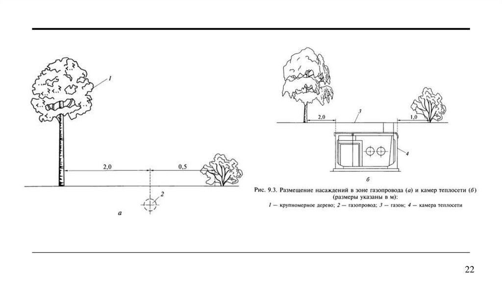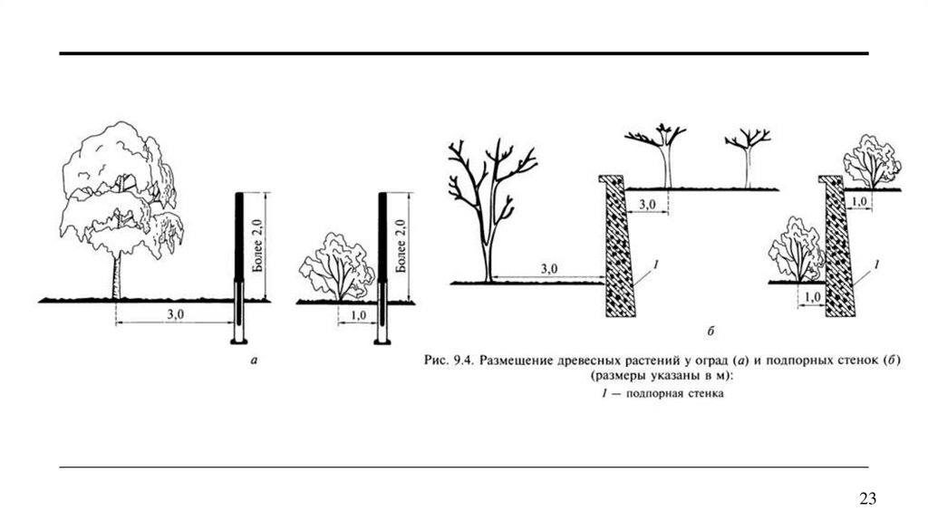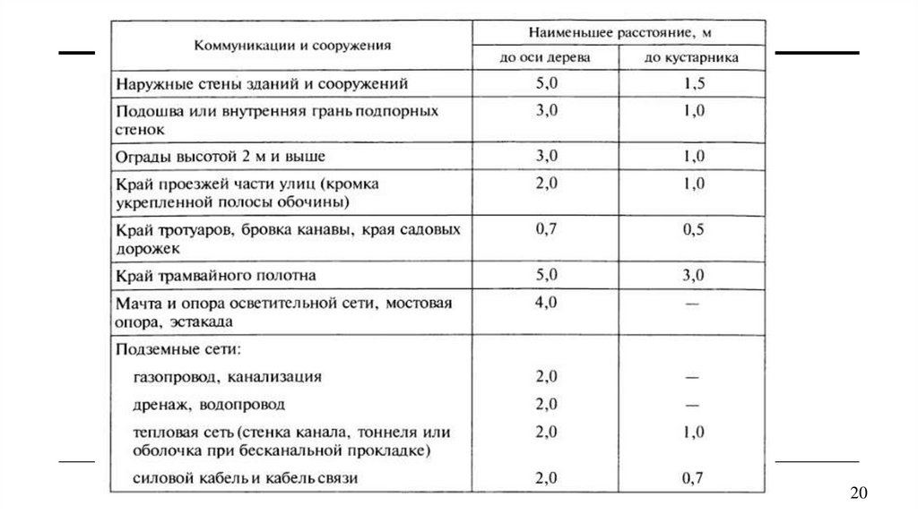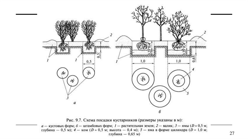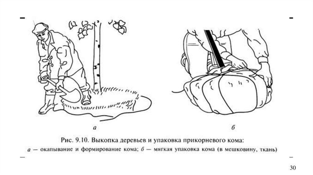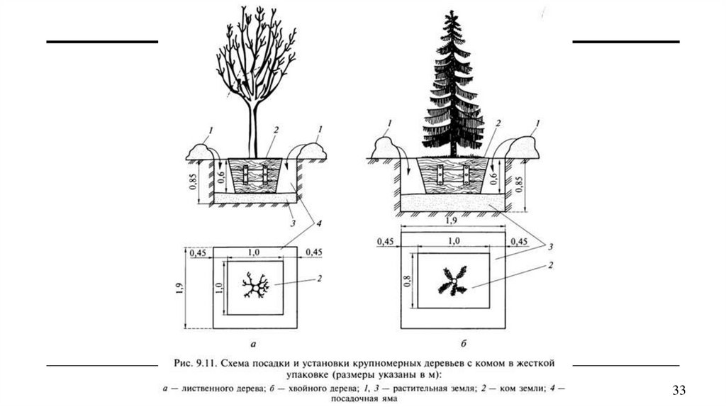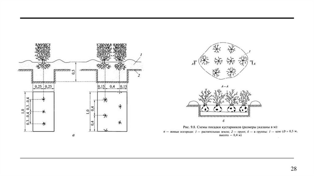 19. В табл. 9.1 приведены размеры посадочных мест для посадки деревьев и кустарников в зависимости от формы и размеров прикорневых