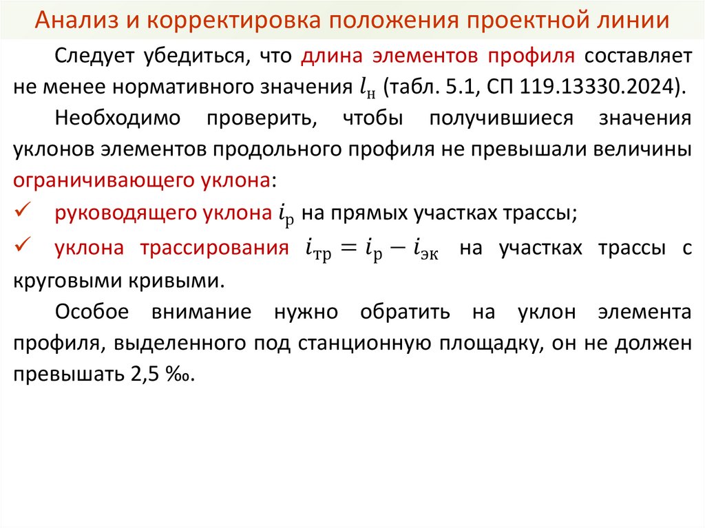 Анализ и корректировка положения проектной линииСледует убедиться, что длина элементов профиля составляет