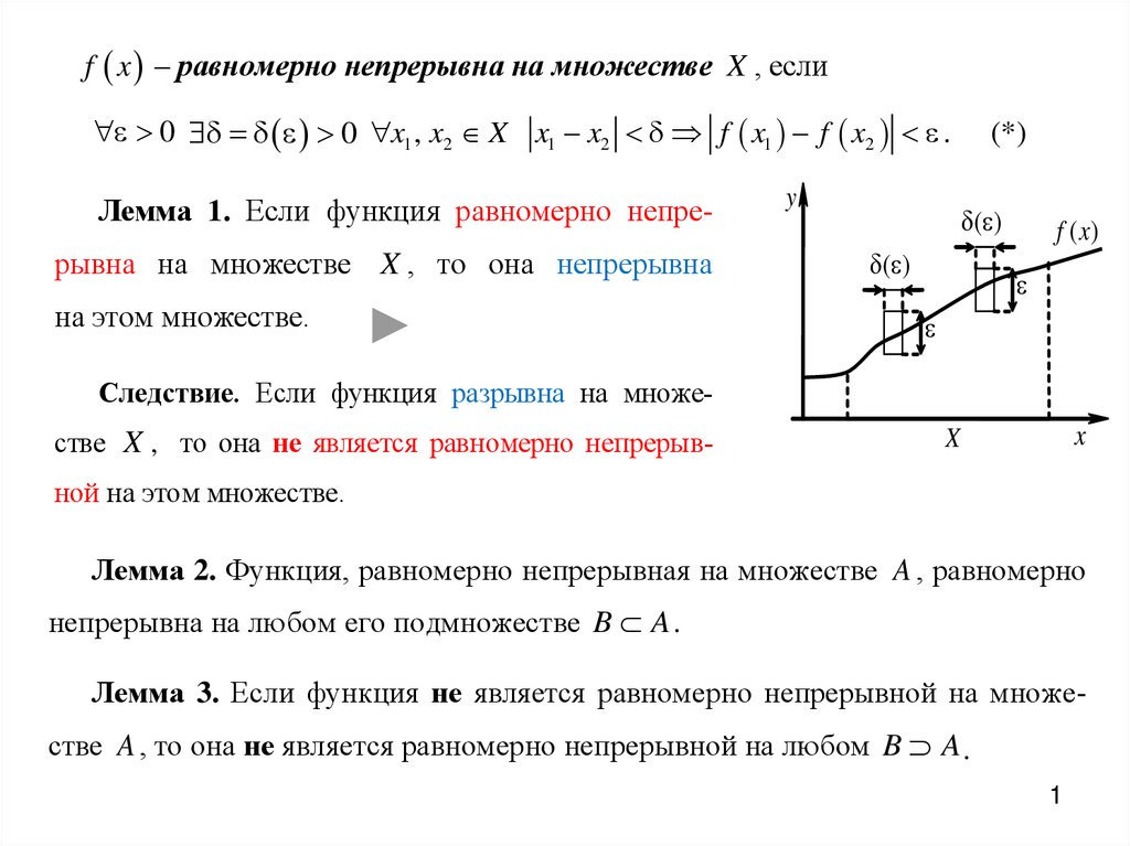 Лемма 1. Если функция равномерно непрерывна на множестве X , то она непрерывна