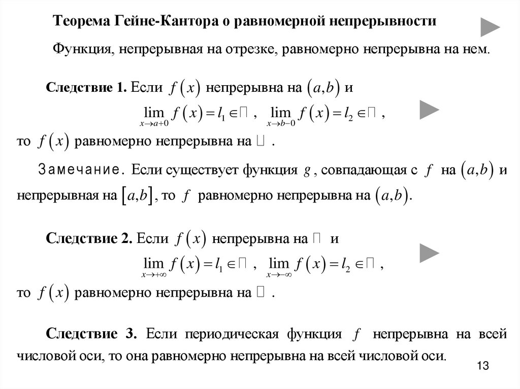 Теорема Гейне-Кантора о равномерной непрерывностиФункция, непрерывная на отрезке, равномерно непрерывна на нем.