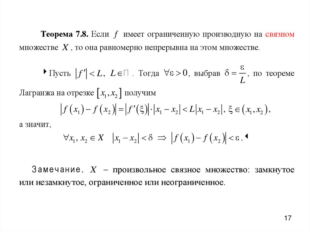 Теорема 7.8. Если f имеет ограниченную производную на связноммножестве X , то она равномерно непрерывна на этом множестве.