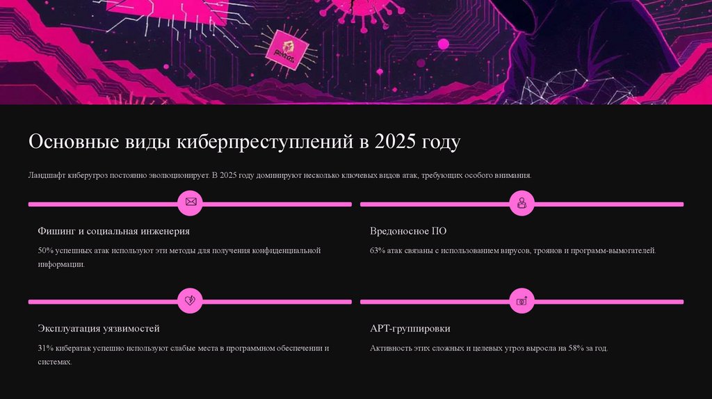 Основные виды киберпреступлений в 2025 годуЛандшафт киберугроз постоянно эволюционирует. В 2025 году доминируют несколько ключевых видов атак, требующих особого внимания.
