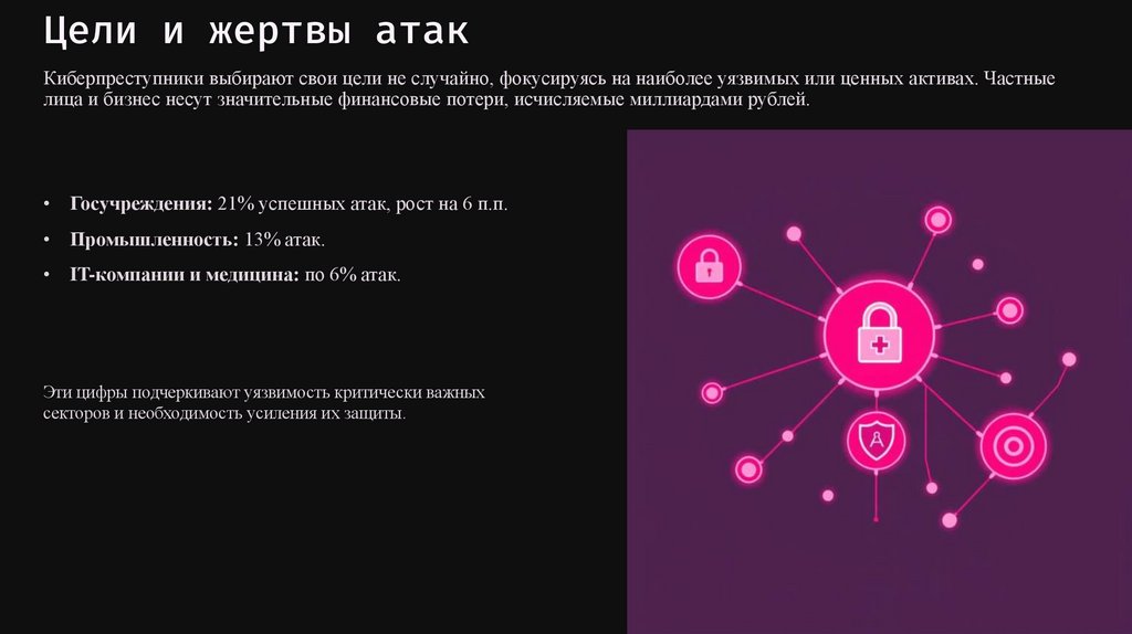 Цели и жертвы атакКиберпреступники выбирают свои цели не случайно, фокусируясь на наиболее уязвимых или ценных активах. Частные