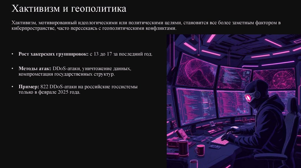 Хактивизм и геополитикаХактивизм, мотивированный идеологическими или политическими целями, становится все более заметным фактором в