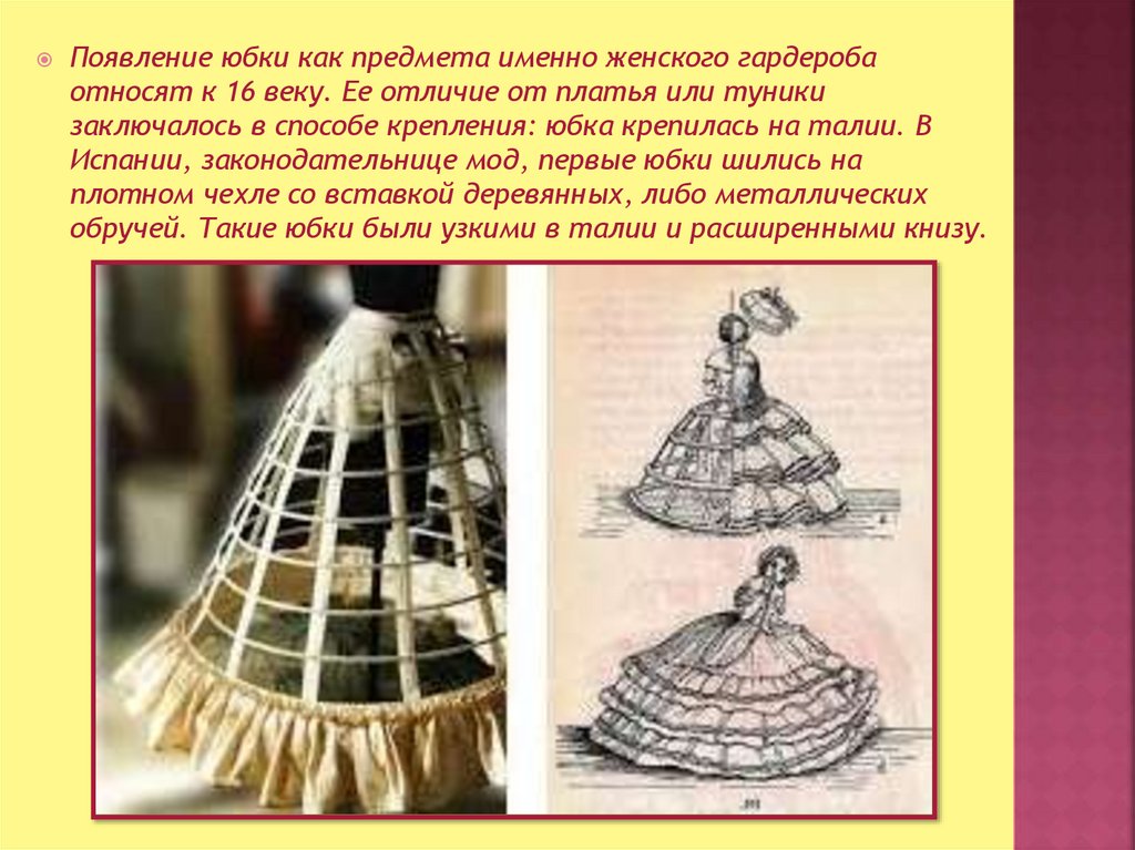 Появление юбки как предмета именно женского гардеробаотносят к 16 веку. Ее отличие от платья или туники