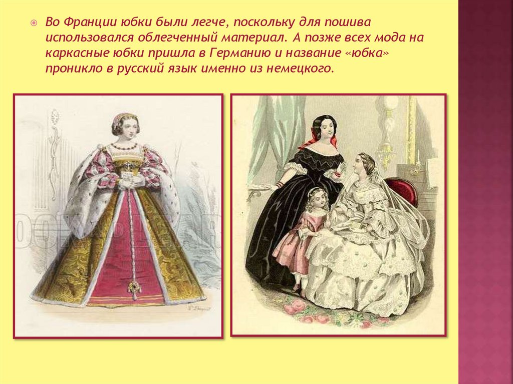 Во Франции юбки были легче, поскольку для пошиваиспользовался облегченный материал. А позже всех мода на