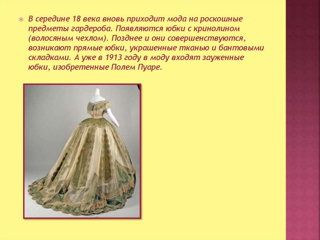 В середине 18 века вновь приходит мода на роскошныепредметы гардероба. Появляются юбки с кринолином
