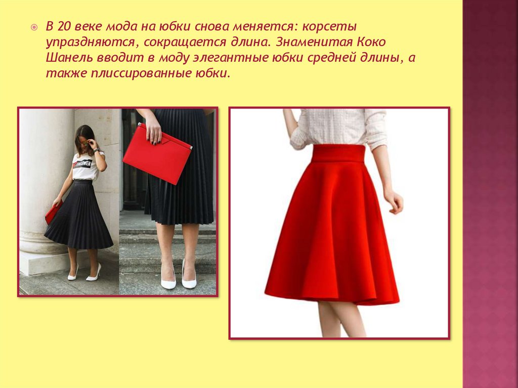 В 20 веке мода на юбки снова меняется: корсетыупраздняются, сокращается длина. Знаменитая Коко
