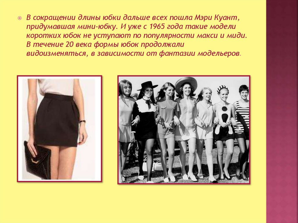 В сокращении длины юбки дальше всех пошла Мэри Куант,придумавшая мини-юбку. И уже с 1965 года такие модели
