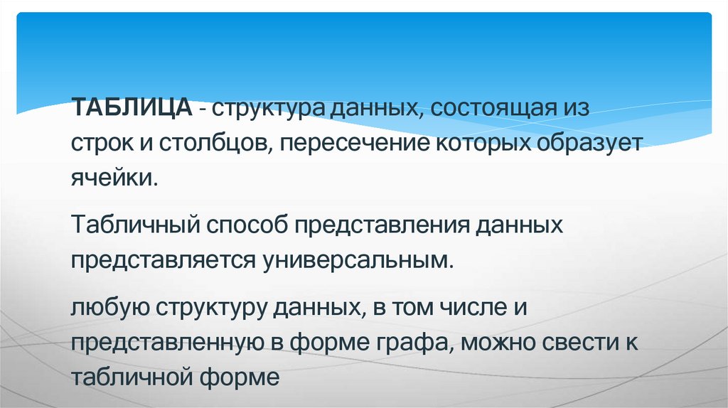 ТАБЛИЦА - структура данных, состоящая изстрок и столбцов, пересечение которых образует