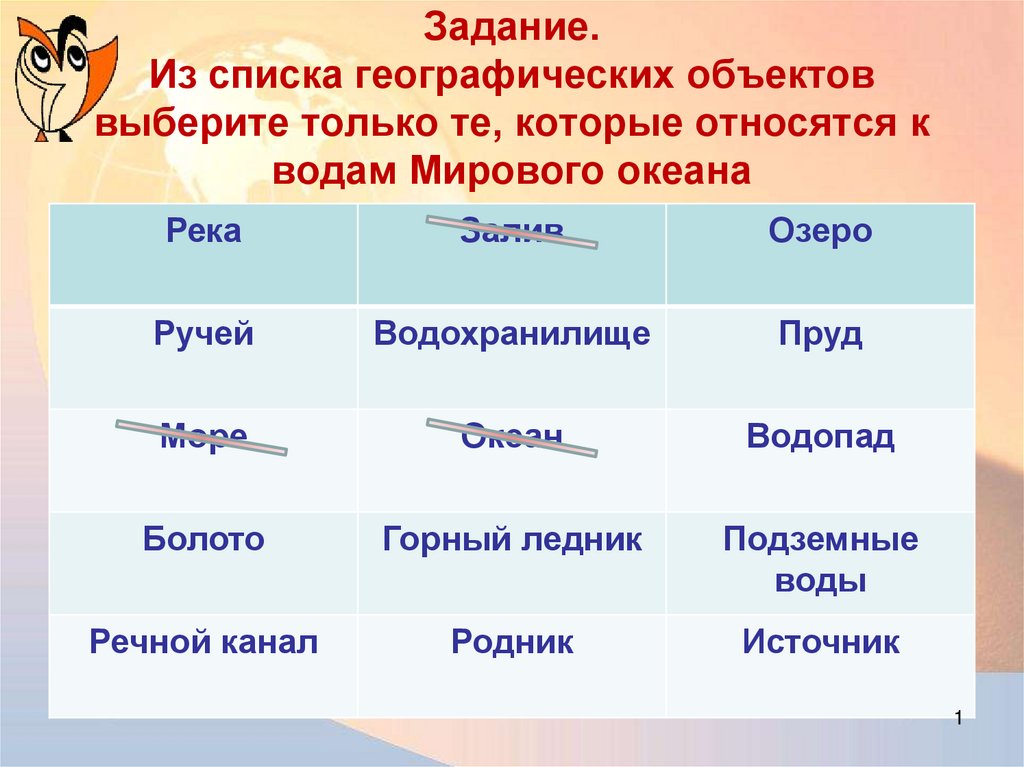 1. Задание. Из списка географических объектов выберите только те, которые относятся к водам Мирового океана