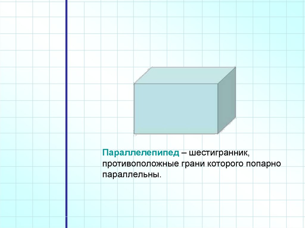 Параллелепипед – шестигранник,противоположные грани которого попарно