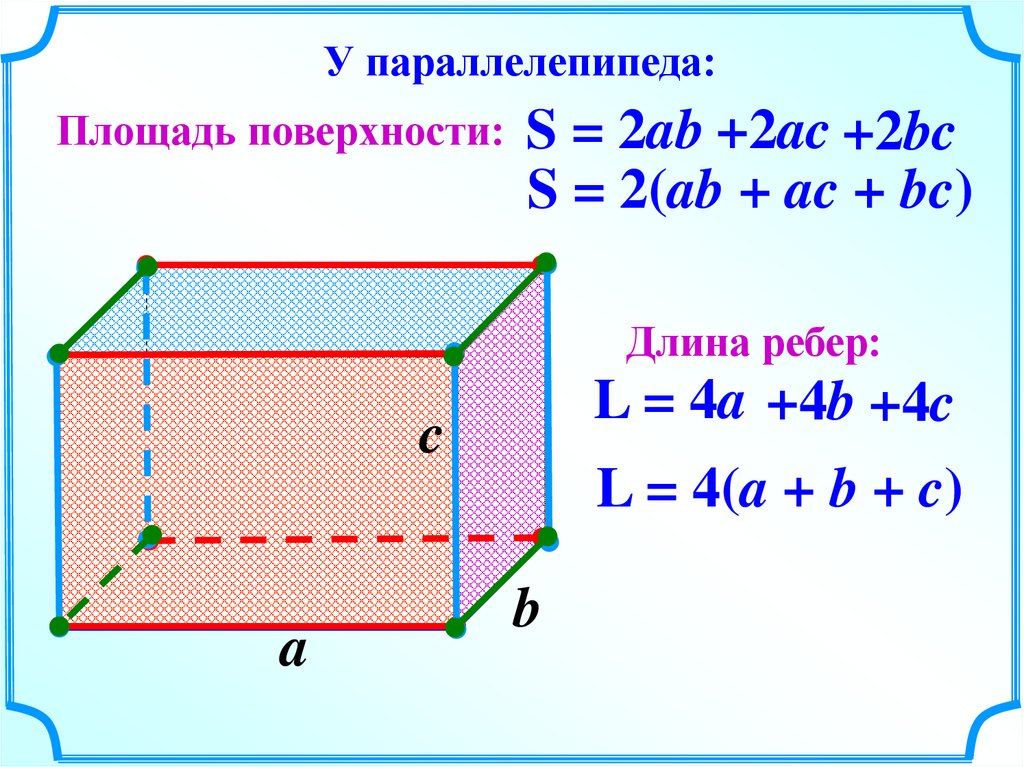 У параллелепипеда:Площадь поверхности: S = 2ab +2ac +2bc