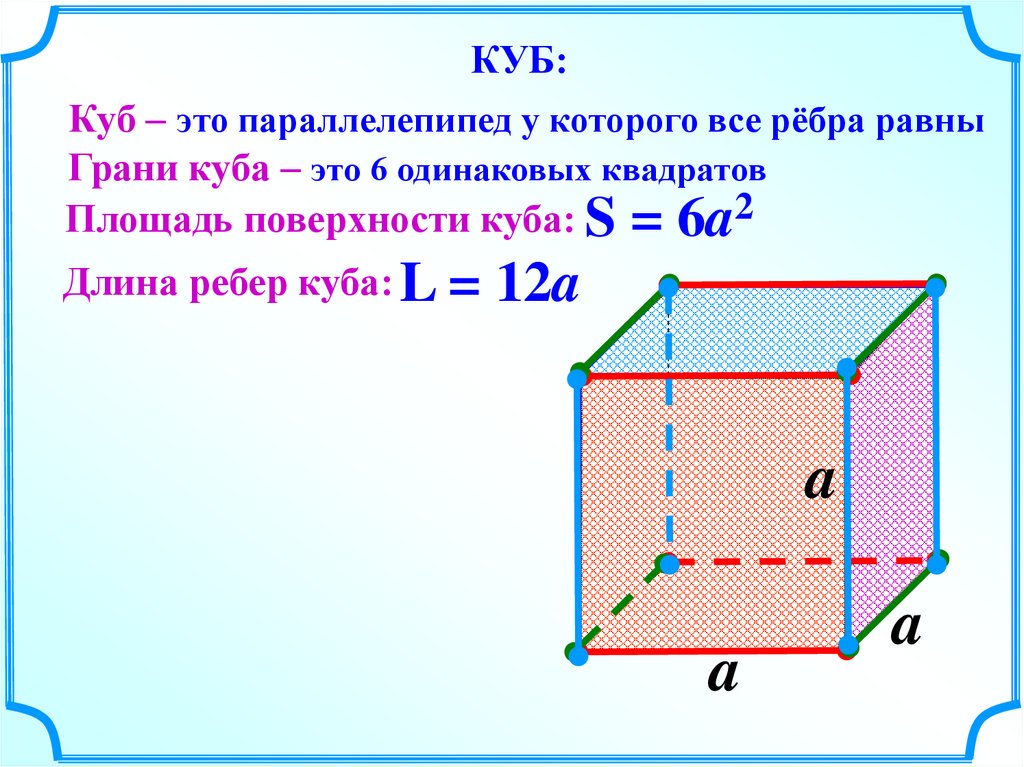 КУБ:Куб – это параллелепипед у которого все рёбра равны