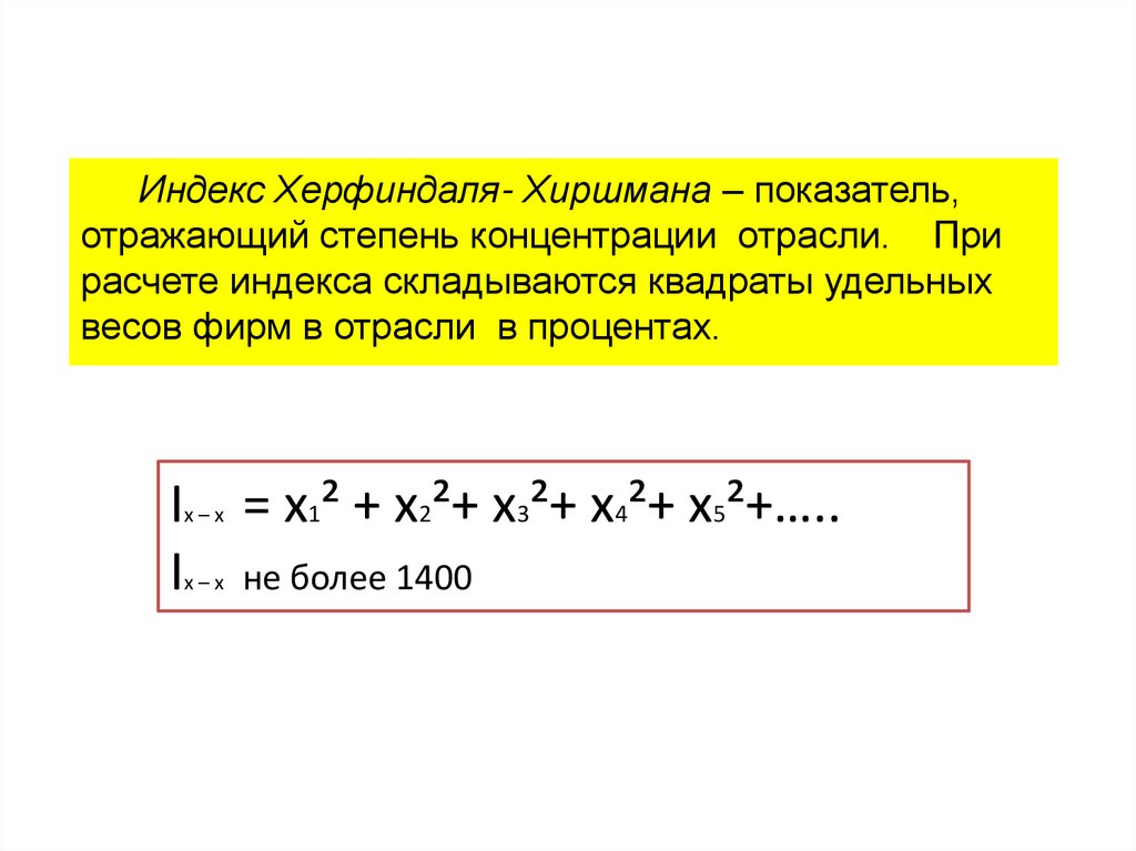 Индекс Херфиндаля- Хиршмана – показатель,отражающий степень концентрации отрасли. При