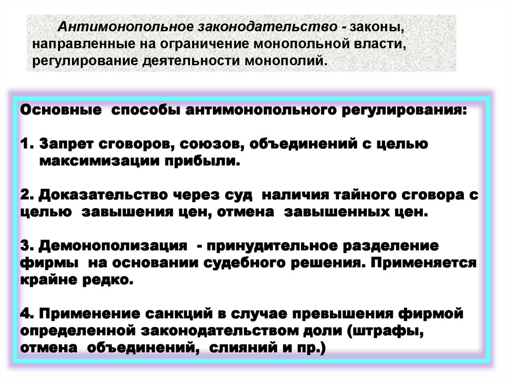 Антимонопольное законодательство - законы,направленные на ограничение монопольной власти,