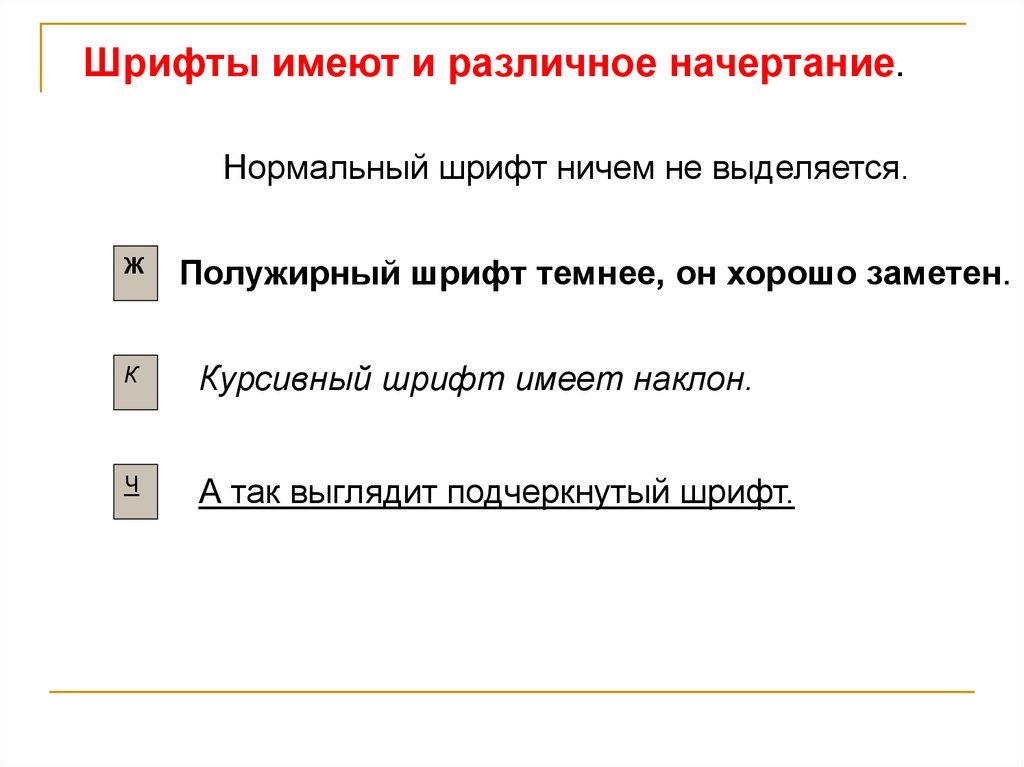 Шрифты имеют и различное начертание.Нормальный шрифт ничем не выделяется.