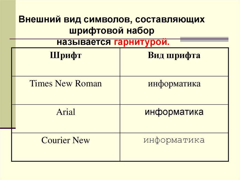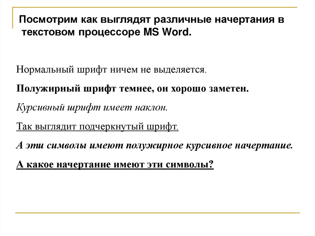 Посмотрим как выглядят различные начертания втекстовом процессоре MS Word.