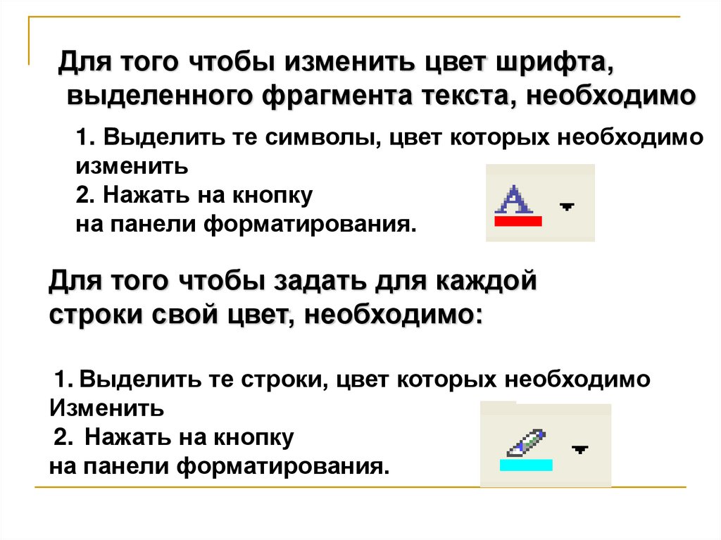Для того чтобы изменить цвет шрифта,выделенного фрагмента текста, необходимо