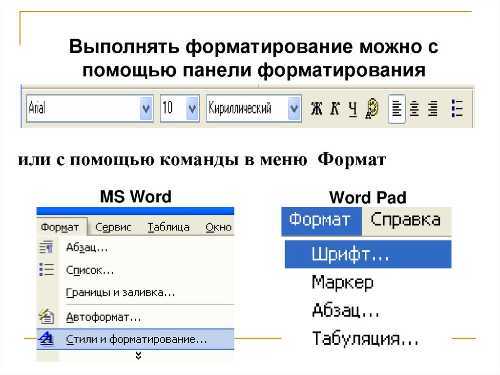 Любой текстовый процессор предусматривает двеоперации изменения формата: