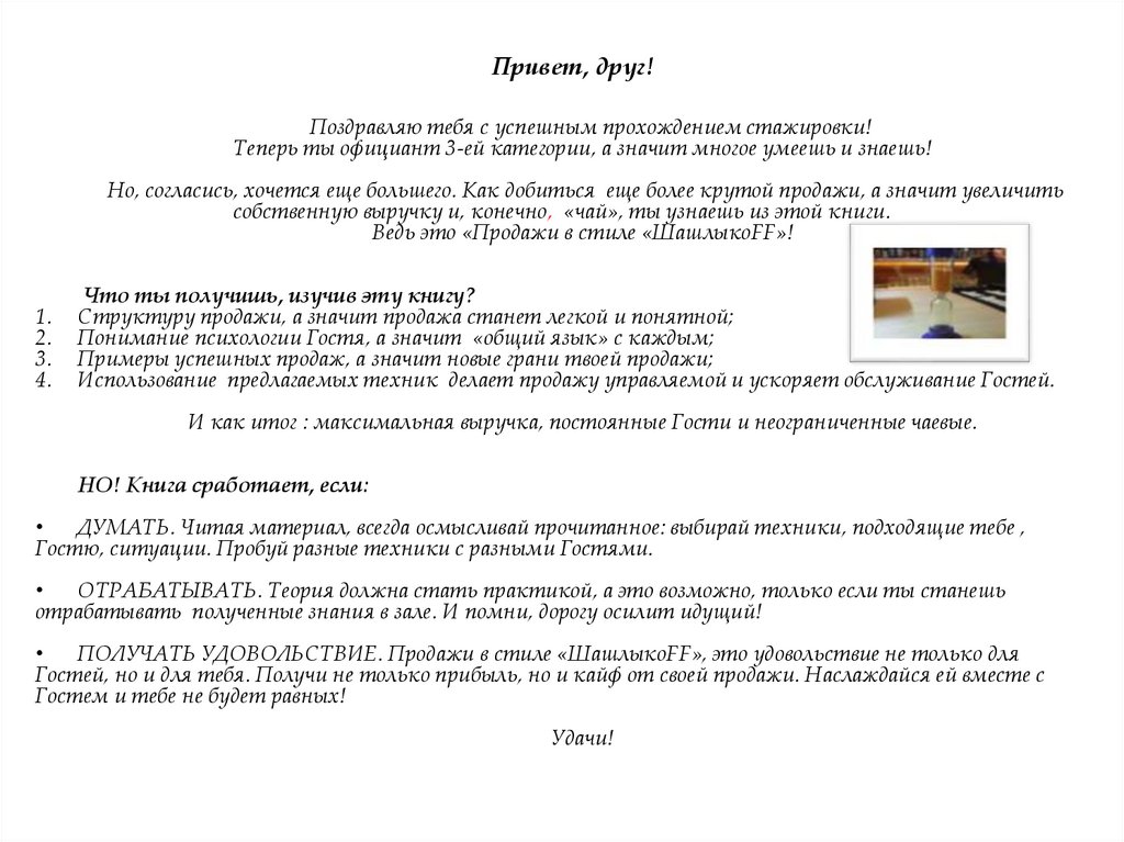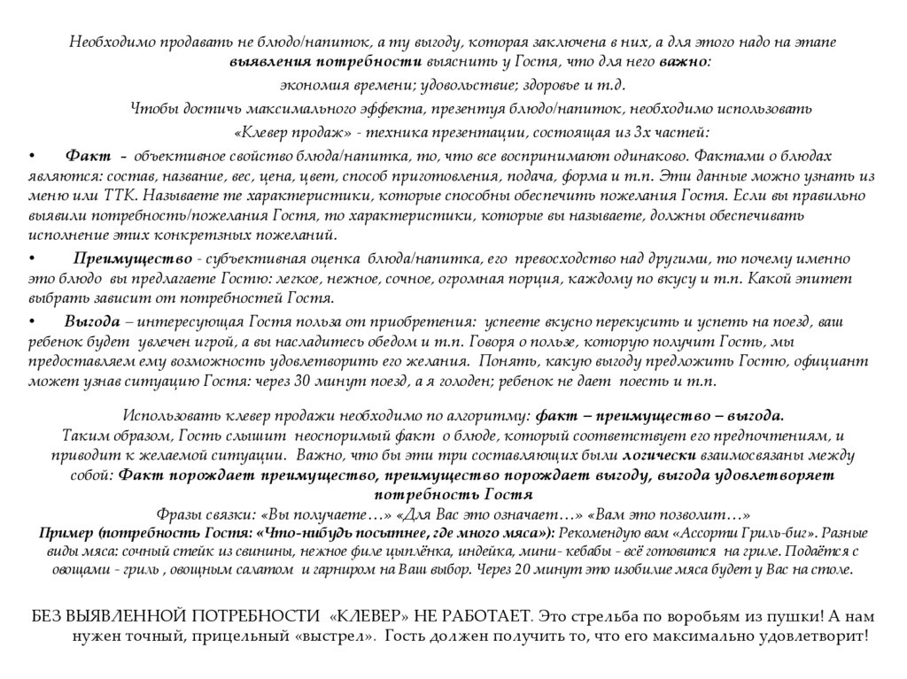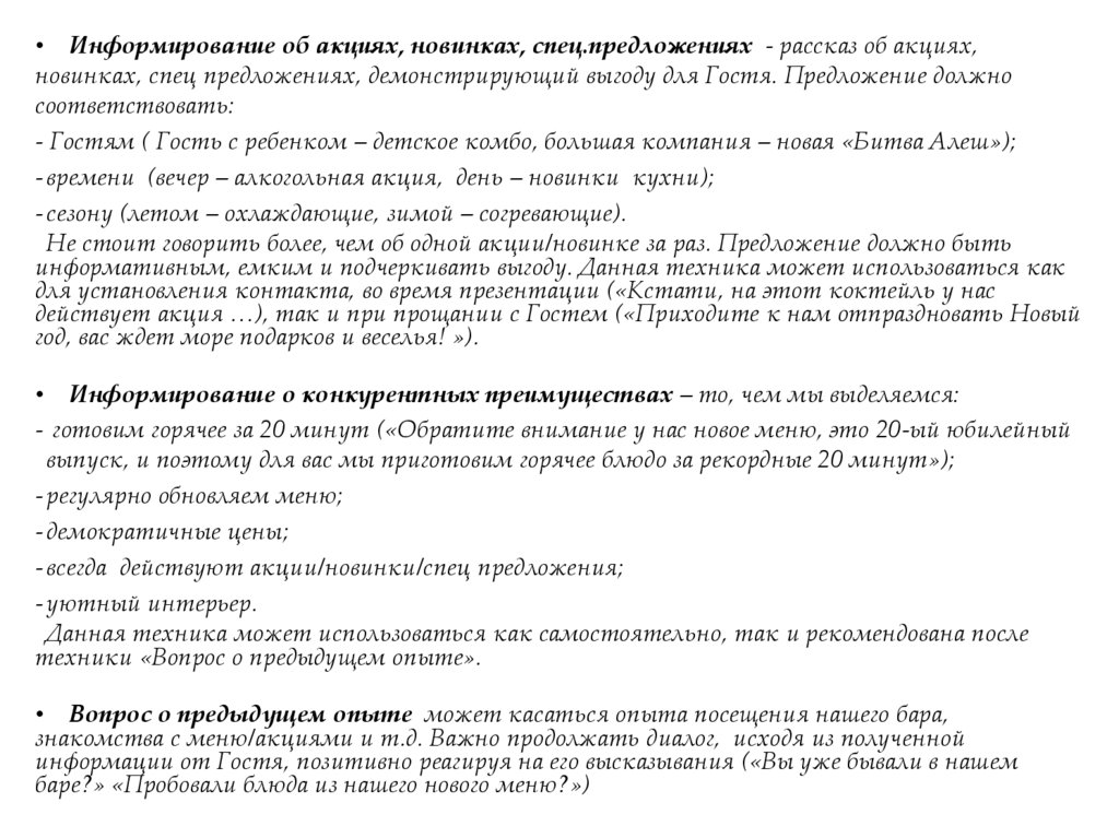 • Информирование об акциях, новинках, спец.предложениях - рассказ об акциях,новинках, спец предложениях, демонстрирующий выгоду для Гостя. Предложение должно