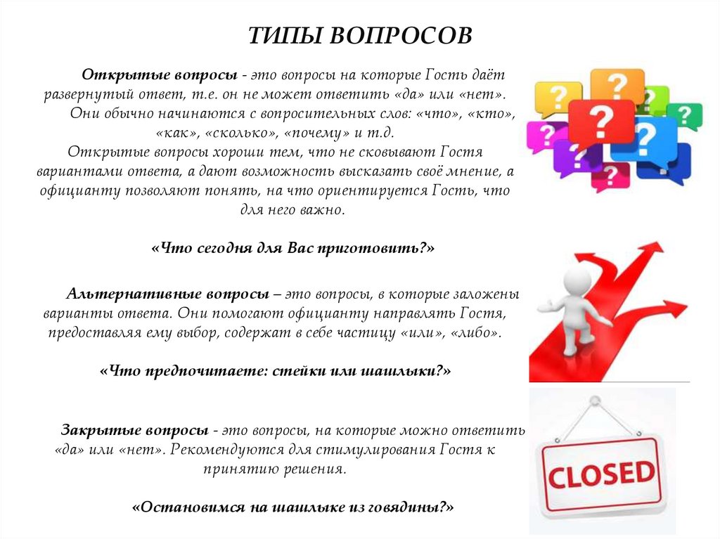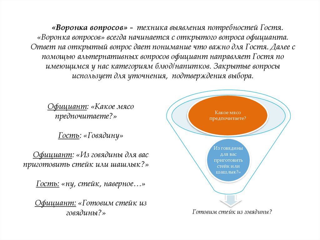 • Вопрос ребром – прямой вопрос о покупке предложенного блюда/напитка. «Как вам?»,