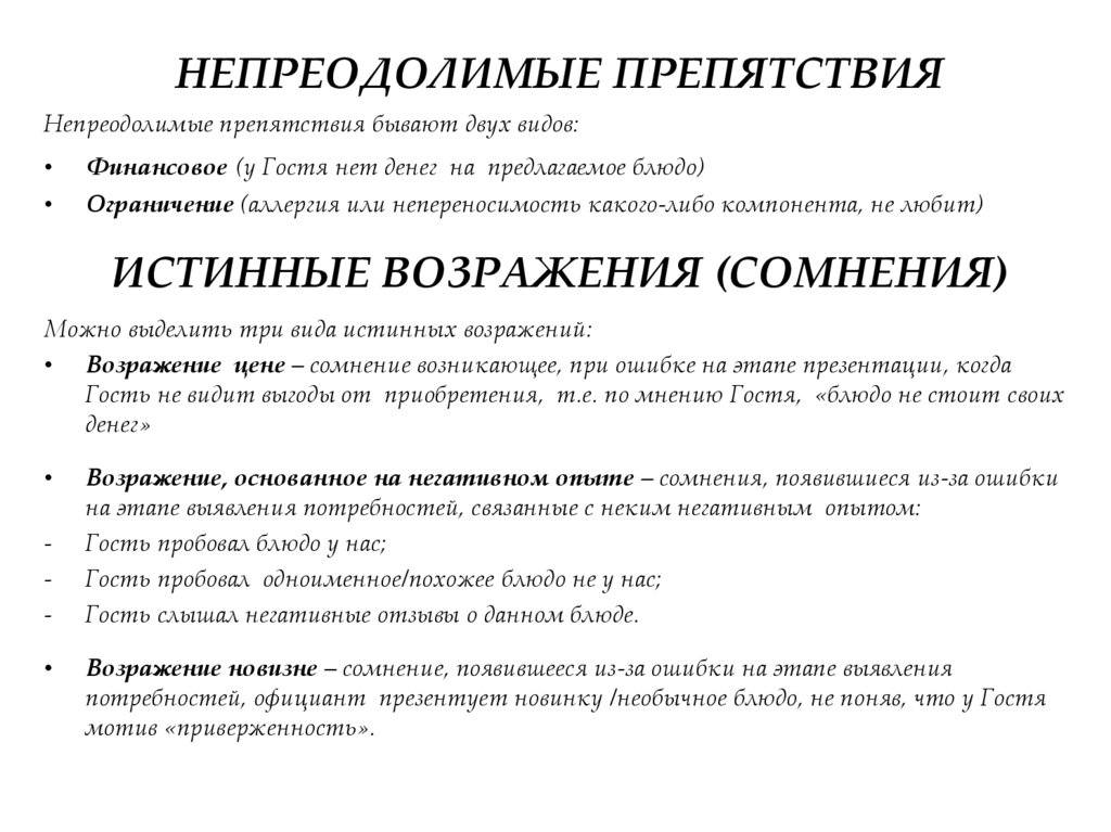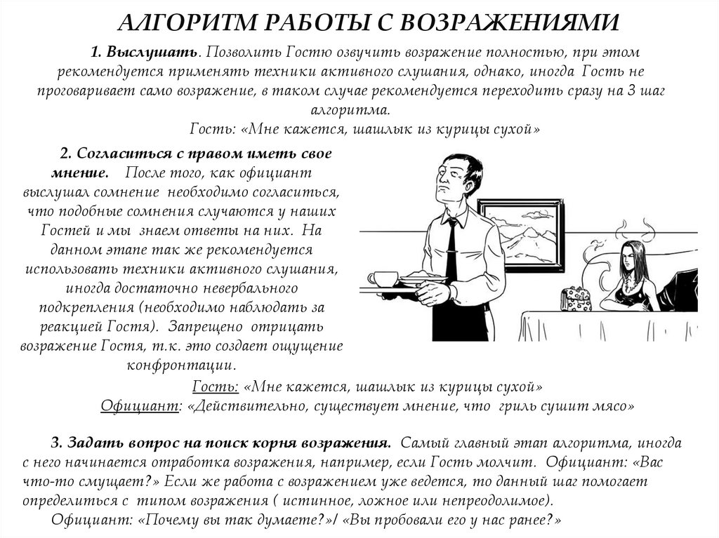 с него начинается отработка возражения, например, если Гость молчит. Официант: «Вас