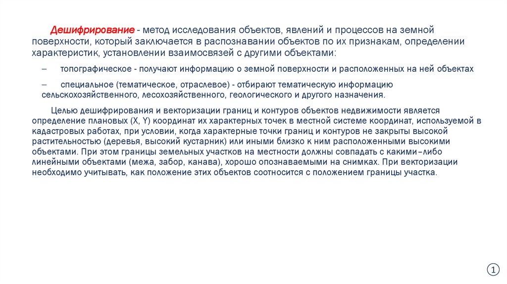 Дешифрирование - метод исследования объектов, явлений и процессов на земнойповерхности, который заключается в распознавании объектов по их признакам, определении