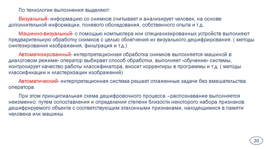 По технологии выполнения выделяют:Визуальный- информацию со снимков считывает и анализирует человек, на основе