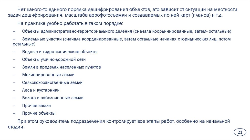 Нет какого-то единого порядка дешифрирования объектов, это зависит от ситуации на местности,задач дешифрирования, масштаба аэрофотосъемки и создаваемых по ней карт (планов) и т.д.
