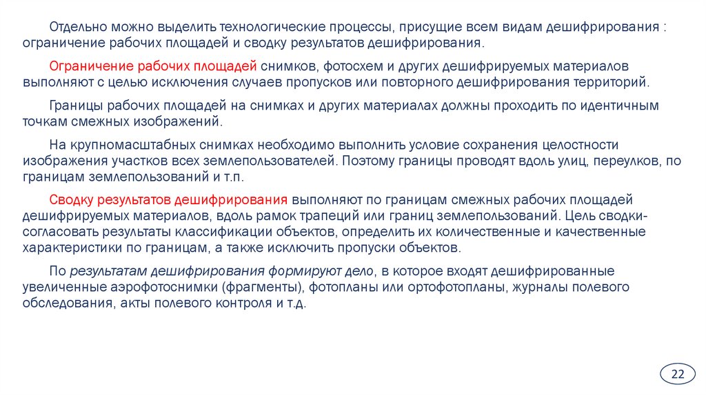 Отдельно можно выделить технологические процессы, присущие всем видам дешифрирования :ограничение рабочих площадей и сводку результатов дешифрирования.